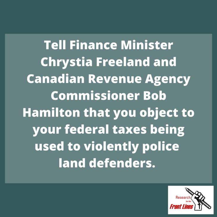 TELL THE FEDERAL GOVERNMENT TO NOT SPEND ANY OF YOUR INCOME TAX TO FUND THE ONGOING CLIMATE CRISIS AND THE VIOLATION OF INDIGENOUS RIGHTS. In our research collaboration with forest defender Molly Murphy, we found that the BC and federal government are spending our tax payer money on the C-IRG, an arm of the RCMP, that are sent in to take down Indigenous blockades and enforce the will of extractive industry, and many more disturbing details. In reaction to these research findings, we are launching a tax strike against public money being used to violently serve private interests. Here’s your chance to tell the federal government not to spend your income tax returns this year on the violation on Indigenous rights and the enforcement of ecocide.